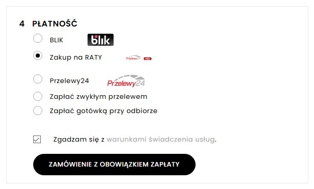- W ostatnim, czwartym kroku PŁATNOŚĆ, wybierz: "Zakup na RATY".