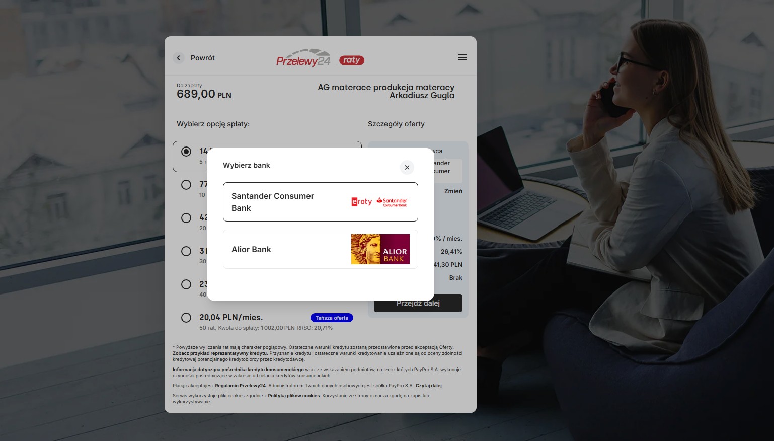 Pod przyciskiem Dodaj do koszyka oraz na stronie Przelewy24 Raty, znajduje się symulator Rat SANTANDER BANK oraz ALIOR BANK, które pozwolą sprawdzić wysokość i ilość rat.